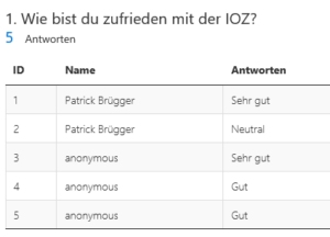 - Falls externe Teilnehmer mit Namen bekannt sein sollen, ist das nur über einen Umweg möglich. Im Formular muss ein entsprechendes Fragefeld hinzugefügt werden. In den Auswertungen werden diese aber als anonymous bezeichnet. Um eine saubere Auswertung zu erhalten, müssen die Daten deshalb nach Excel exportiert werden.